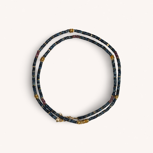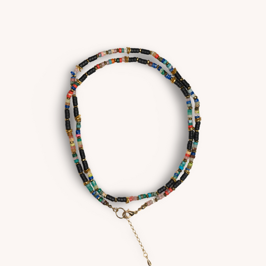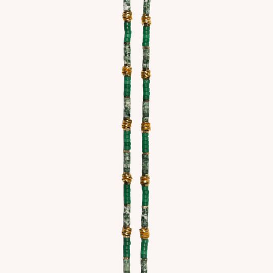 This is a flagship collection called "Grace," featuring light, airy, and delicate jewelry. The necklaces can be worn long or doubled for versatility. The vibrant colors evoke summer and evolve with trends, regularly updated according to the seasons. These necklaces are the perfect pieces to accumulate in any collection.