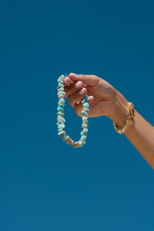 A light and breezy collection reminiscent of beaches and summer. The pearls are shaped like 'chips,' evoking colorful pebbles or small seashells. Each stone has a unique shape, yet the overall look remains beautifully harmonious. Touches of gold bring a hint of elegance, making these pieces the perfect complement to any outfit.