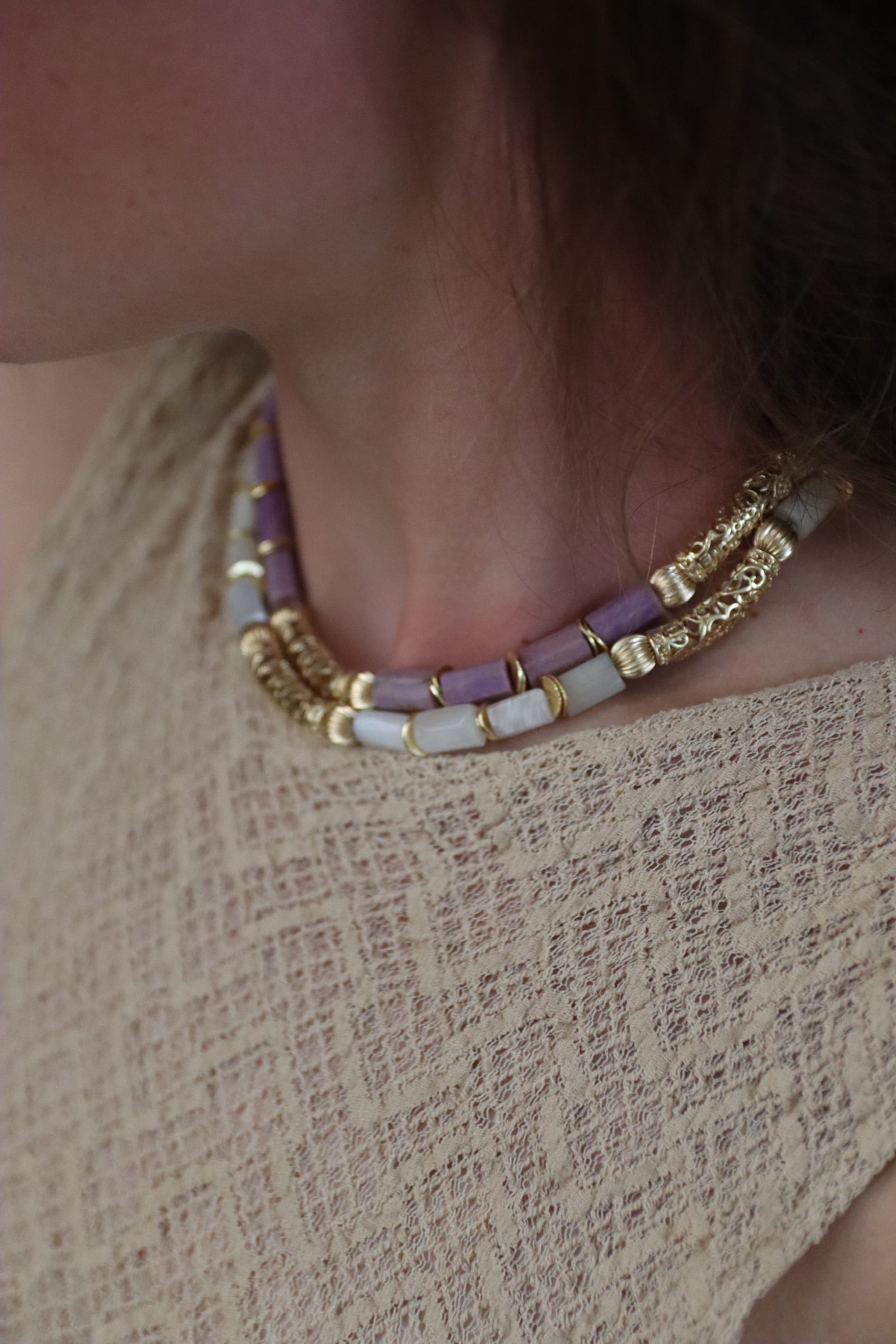 The Lilac Olympe necklace is a choker combining delicate gold-filled tubes with a lace-like openwork design, baroque phosphosiderite cylindrical pearls and gold-filled ribbed shiny round beads. The gentle lavender hues meet the golden glow in a whisper of softness, blending romantic charm with contemporary sophistication.
