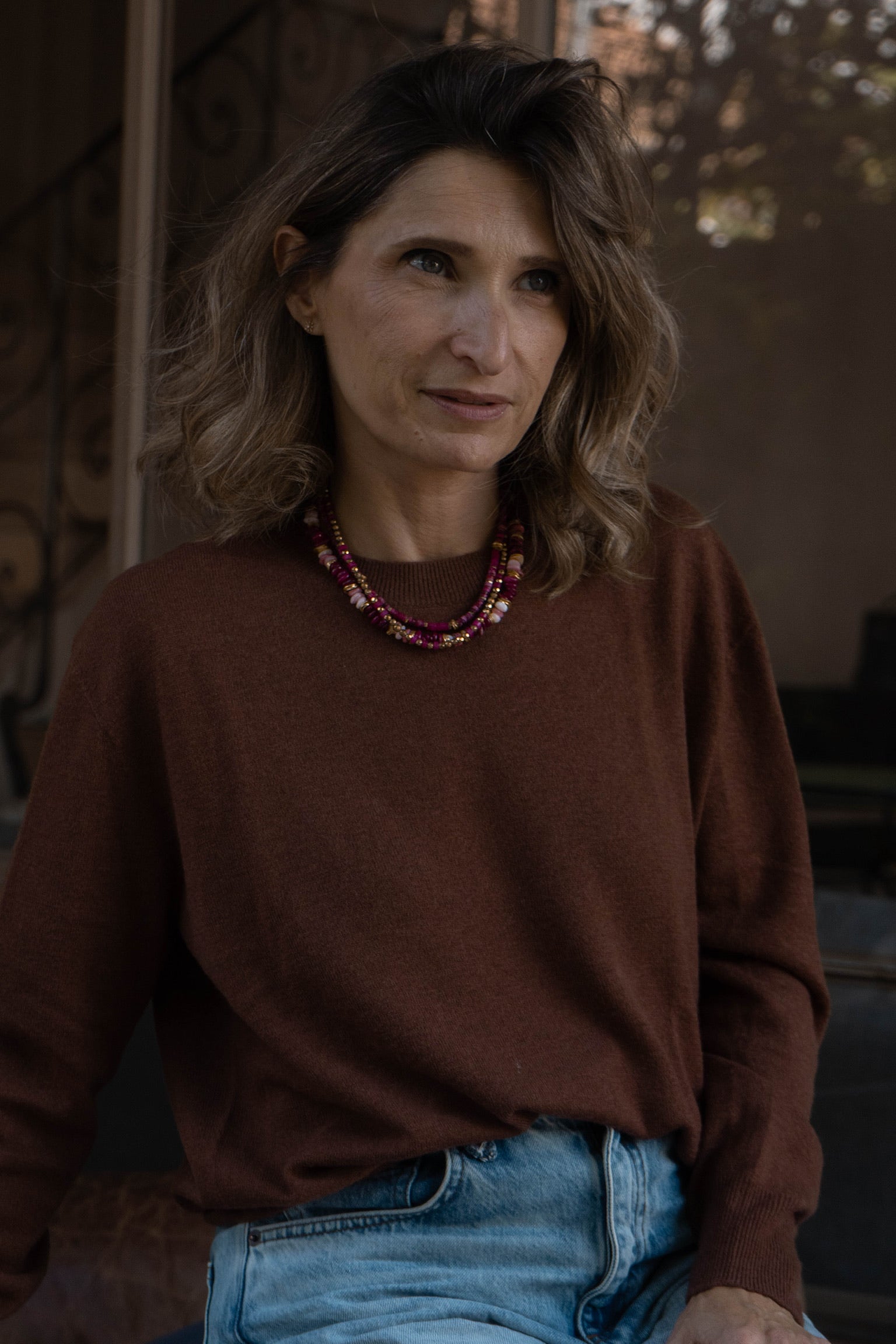 The ELENI Necklace showcases a stunning combination of fuchsia shell chip beads, fuchsia heishi stone beads, and hematite stone beads, accented with gold-plated findings, making it a striking statement piece for any occasion.