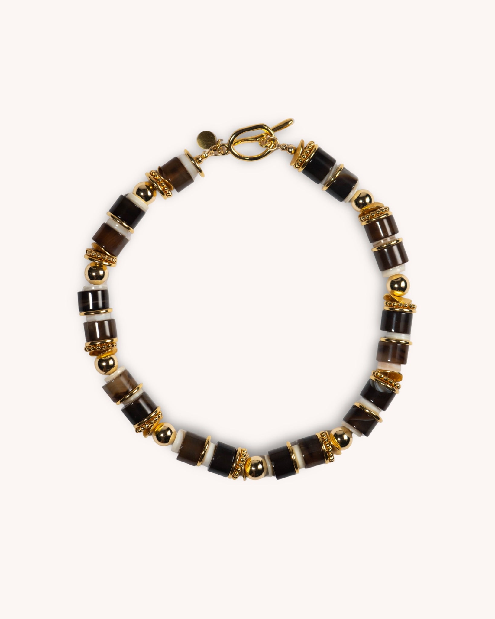 The NOOR Necklace has that effortless chic that works from day to night. The warm glow of brown agate blends beautifully with off-white shell discs and touches of gold, creating a palette that feels rich yet easy to wear. Whether slipped over a white blouse, layered with soft knits, or paired with jeans for a more relaxed look, it adds instant sophistication without trying too hard.